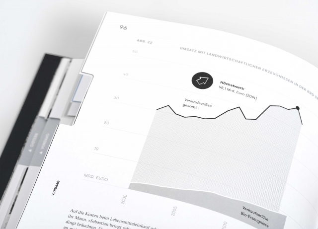 Alle Texte des Lageberichtes werden umfangreich von Infografiken unterstützt, die die Gesprächsthemen mit Fakten anreichern. Bei der Gestaltung der Grafiken haben wir Wert auf einen zurückhaltenden, aber dennoch abwechslungsreichen und spannenden Eindruck gelegt. Dementsprechend kommen hier ein ausschließlich monochromes Farbspektrum und eine konstruierte Schrift zum Einsatz, während die Darstellungsweise der Grafiken sehr variabel ist.